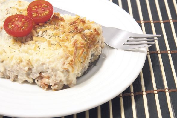 4. Prebacite u podmazan đuveč ili tepsiju, izjednačite i narendajte malo kačkavalja.