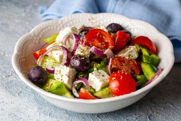 U većoj činiji, izmešajte naseckano povrće, posolite i prelijte maslinovim uljem. Izmiješajte i dodajte masline.