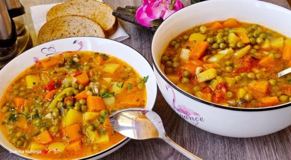 Priprema: Na ulju propržiti luk šargarepu i papriku. Kad se prodinsta to povrće, dodati krompir i grašak i naliti vodu da ogrezne. Posle 30 minuta dodati kukuruzni skrob razmućen sa malo vode. Dodati slatku ml papriku, suvi začin i malo peršunovog lista.
