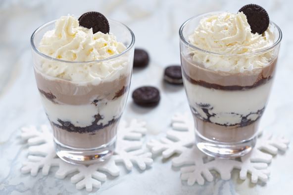 4. Dodajte u čašu ovim redom: Oreo kolačiće, smesu od čokolade, šlag, Oreo kolačiće, smesu od čokolade, šlag, a zatim pospite još malo izmrvljenih Oreo kolačića odozgo.