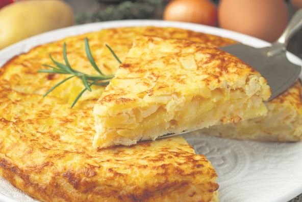 2. U većem tiganju zagrejati ulje, dodati mu luk i pržiti ga dok ne postane staklast. U to sipati smesu s jajima i pustiti da se na laganoj vatri prži desetak minuta. Okrenuti je na drugu stranu, kao palačinku. Omlet treba da bude blago braonkast.