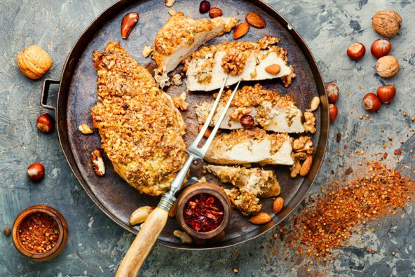 1. Zagrejte rernu na 250 stepeni. Na velikom tanjiru izmešajte prezle, alevu papriku, so i biber. Sameljite orahe i peršun sve dok ne budu fine teksture. Ubacite u smesu s prezlama i dobro sjedinite.