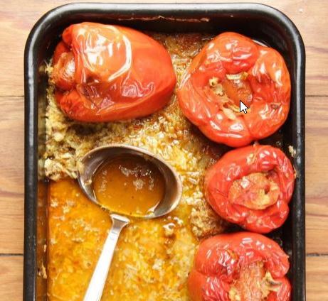 Pokrijte šerpu i kuvajte na srednje tihoj vatri 30–40 minuta, dok pirinač ne omekša, a paprika postane mekana.