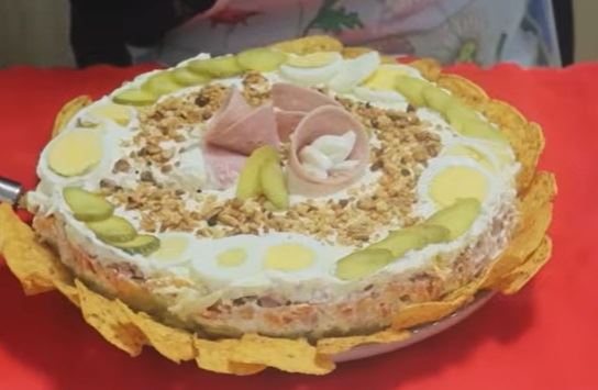 - Završite tako što sve premažete majonezom i pavalkom i ukrasite kuvanim jajima, krastavčićima i tortilja čipsom.