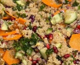 - Skuvajte kinou i pomešajte je sa seckanim lukom, svežim narom, krastavcem , peršunom i orasima.