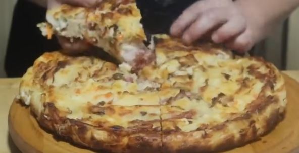 - Tim filom filovati koru za pitu, a preko posuti seckanu papriku, masline, sir i slaninu.
