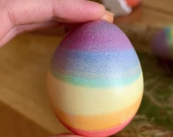 Ovo je najzanimljiviji deo. Potrebno je da umočite same vrhove jajeta u crvenu boju, jedan po jedan. Žuto-narandžasta strana dobiće tamnocrvenu prugu, dok će plavo-zelena strana završiti sa ljubičastom nijansom. Duga je sada formirana – potrebno je samo da se jaje ponovo osuši.