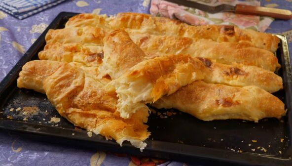 Svaku lopticu razvucite u mali krug prečnika 10–15 cm. Zatim slažite po tri kore jednu preko druge, premazujući svaku uljem (uključujući i poslednju), vodeći računa da nema suvih delova.