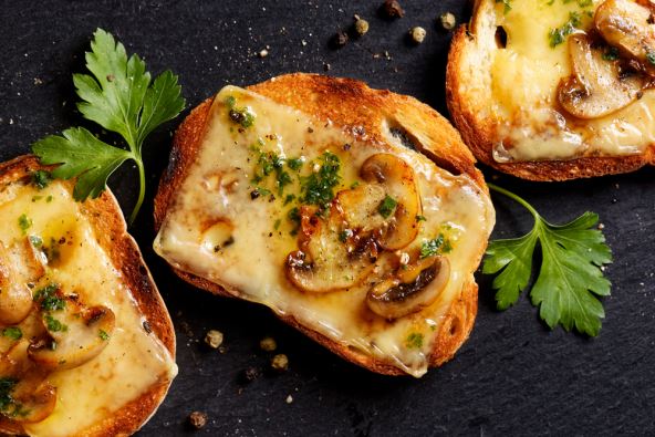 4. Sipajte smesu na tost hleb a onda ga dobro zagrejte u rerni da porumeni i dobije zlatkasto - braonkastu boju. Po želji, možete ga zapeći zajedno sa prethodno pripremljenim pečurkama.