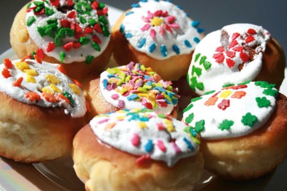Penasto umutite puter sa šećerom i žumancima. Dodajte badem pomešan sa cimetom, rendanu limunovu koru i dobro umućena belanca. Sve promešajte, dodajte brašno i zamesite glatko testo. Od testa napravite poluloptu, uvijte u providnu foliju i ostavite u frižider da odstoji jedan sat. Uzimajte manje delove, pravite kuglice i ređajte u pleh postavljen papirom za pečenje. Pecite na 180 stepeni oko 20 minuta. Pečene kuglice ostavite da se ohlade, a zatim ih prelijte mešavinom umućenog šećera u prahu, limunovog soka i vode. Na svaku kuglicu stavite po jednu bombonicu u boji, ostavite da odstoji na sobnoj temperaturi oko dva sata, a zatim služite.