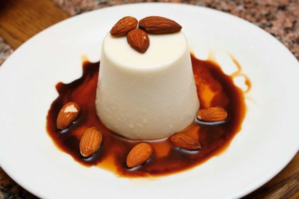 Stavite listiće badema na papir za pečenje i pecite ih u rerni na 180 stepeni pet do 10 minuta dok ne postanu zlatni, s vremena na vreme ih protresite. Razdvojte belanca od žumanaca. Belanca ulupajte u sneg. Mikserom umutite žumanca sa šećerom tako da postanu kremasta. Dodajte mleveni badem, amareto i desertno vino, pavlaku i sneg od belanaca. Mešajte krem dok ne postane čvrst. Smesu raspodelite u male posude i ostavite u zamrzivaču najmanje 12 sati. Izvadite iz zamrzivača petnaestak minuta pre služenja, umočite dno posudica u toplu vodu i okrenite ih na tanjir. Ukrasite listićima badema i poslužite.