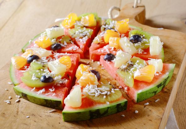 Isecite lubenicu na kolutove, da bi vam bilo lakše za sečenje isecite odmah i trouglove, odnosno komadiće "pice", poređajte po svakom parčetu voće po želji i uživajte.