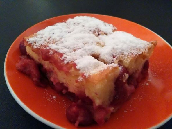 Sipajte smesu u prethodno podmazan pleh. Pospite je sa 500 g višanja. Ako ostanu po vrhu, potisnite ih nožićem u testo.