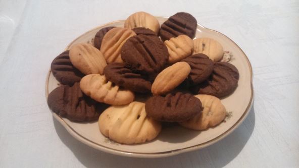 Postupak: Zamesite testo (margarin, šećer u prahu, puding (u prahu) i brašno), pa ga ostavite umotanog u foliji u frižideru na 30 minuta. Nakon toga, testo izvadite iz frižidera i oblikujte u valjak. Valjak isecite na jednake parčiće veličine pola cm. Treba da ima 36 isečenih parčića.