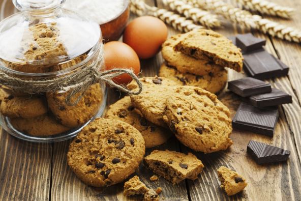 2. U posebnoj činiji izmešajte ovsene pahulje, prašak za pecivo, cimet i so. Te sastojke polako dodajte u činiju s prethodnim sastojcima i mešajte dok ne dobijete jednoličnu smesu. Zatim dodajte komadiće čokolade i brusnice.