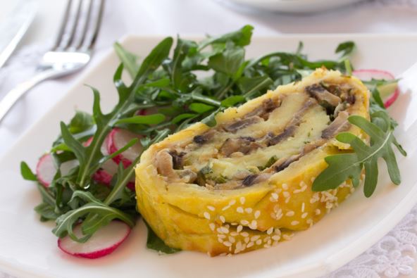 4. Mešavinu sa crnim lukom i slaninom rasporediti po lisnatom testu, a onda preko toga dodati mešavinu sa sirom i povraem. Štrudlu pažljivo zaviti u rolnu i peći 35 minuta. Povremeno premazati rolnu rastopljenim maslacem.