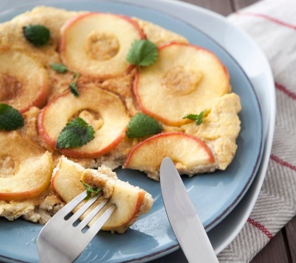 1. Umutite 2,5 dl mleka, 125 g brašna, 4 jajeta imalo soli. Ostavite testo da miruje oko pola sata. Oljuštite 4 jabuke, podelite ih na četvrtine pa ih dalje izdelite na tanje kriške.