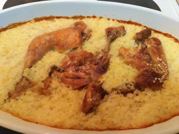 Podmažite pleh maslacem, i dno prekrijte prethodno opranim pirinčem (dovoljan je sloj debljine kažibrsta). Preko pirinča stavite dve do tri kockice za supu, u zavisnosti od toga koliko želite da vam jelo bude slano i začinjeno. Ako nemate kocke za supu, može da posluži vegeta.