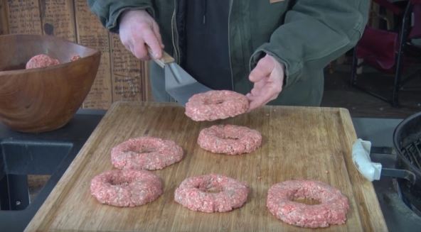 Naime, on je oblikovao meso u obliku lopte, zatim ju je istanjio, a u centru napravio rupu, tako da je dobio krofnu od mesa. Zatim ju je napunio raznim dodacima - piletinom, lukom, šunkom, pečurkama, jajetom. Preko toga je dodao kačkavalj i prženu slaninu, a vi možete da dodate šta god poželite, čak i neki sos po svom ukusu. Poklopite na oko desetak minuta.