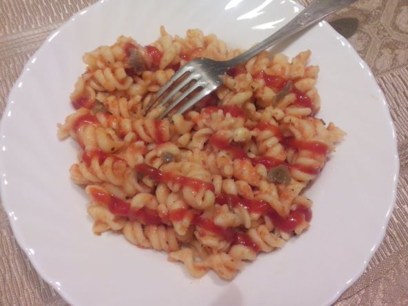 3. Mešajte dok se ne zgusne, skinite sa vatre, izmešajte sa testeninom, a po želji dodajte malo bibera i ukrasite sa malo kečapa.