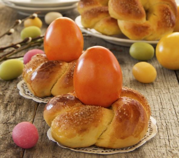 Nadošle lopte od testa premažite umućenim žumancetom i pospite krupnim šećerom, pa malim nožićem zarežite 3 reza od sredine pogače prema spolja. Stavite lopte da se peku u rernu zagrejanu na 180 stepeni oko 20 minuta.
