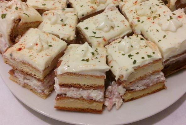 4. Ohlađenu koru presecite na pola, pa jednu polovinu namažite filom. Poklopite drugom korom i na kraju premažite maslacem ili krem sirom. Ukrasite mlevenom paprikom i peršunom, pa dobro ohlađeno secite na kockice.
