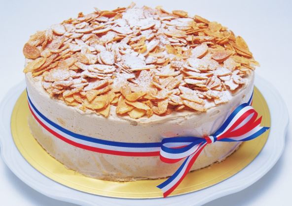 4. Okolo i odozgo namazati tortu istim kremom, pa je posuti uzduž isečenim bademima.