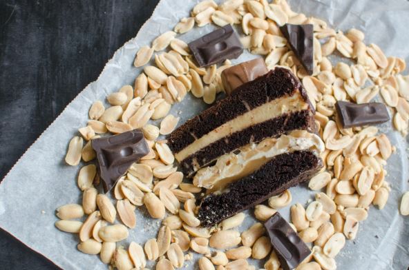 Polovinu ovog krema premažite preko prvog nugat sloja. Zatim pospite seckani kikiriki po vrhu i koristeći spatulu malo ga samo utisnite u isti sloj. Potom ponovo prelijte karamelom preko i pospite ostatak kikirikija. Zamrznite na sat vremena.