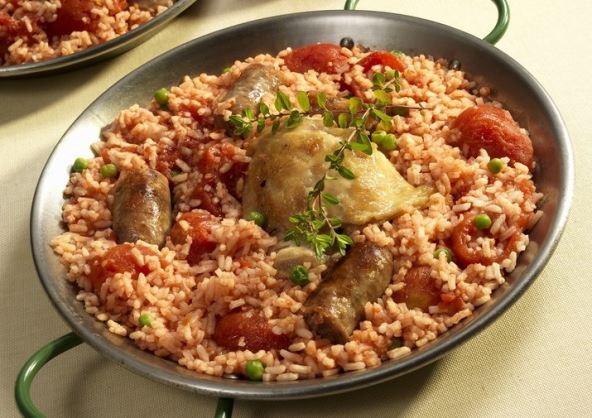 1. Paprike i paradajz iseći na kocke, a pileće meso na tanke duguljaste parčiće i ispržiti u tiganju na zagrejanom maslinovom ulju. U šerpu sa provrelom vodom staviti pirinač da se kuva.