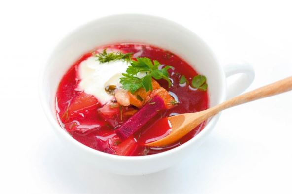 Govedinu prelijte hladnom vodom i stavite da se kuva. Kad meso provri, dodajte kupus isečen na komade. Cveklu, šargarepu, paškanat, peršun i crni luk isecite na jednake komade, pa malo prodinstajte u poklopljenoj šerpi sa nekoliko tankih režnjeva slanine. Zatim sve stavite u lonac gde se kuva meso. Napravite zapršku i dodajte u lonac. Dodajte krompir i paradajz koji ste isekli na polovine. Pred sam kraj dodajte isceđeni sok od rendane cvekle i ostavite da ključa. Pre služenja začinite kiselom pavlakom.