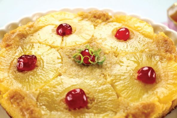 Sipajte u nauljen i brašnom posut kalup za torte pa pecite u rerni 20 minuta na 200 stepeni. Ohlađen biskvit premažite pekmezom pa poređajte kolutove ananasa i pomorandže. Dodajte višnje i stavite u frižider da se malo stegne. Pripremite želatin i dodajte još 50 g šećera. Ohlađen želatin prelijte preko voća. Kada se torta stegne, dekorišite je šlagom.