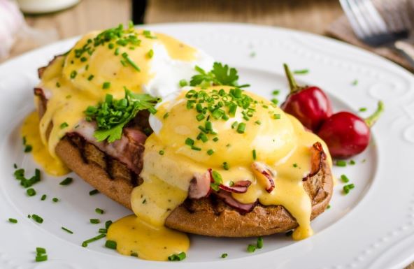 4. Na zagrejane polovine pogačica namažite puter, pa stavite preko slaninu i poširana jaja. Prelijte pripremljenim sosom i dekorišite po želji.