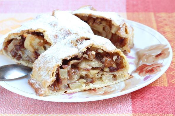 Nadev stavite po sredini duže strane testa: 2 jabuke rendajte direktno na testo, ravnomerno pospite 1 kašikom šećera, 1 vanilin šećerom, rendanom korom od pola limuna, 1 kašikom prezli, po želji grožđicama i cimetom. Prebacite jednu praznu stranu lisnatog testa preko nadeva, pa drugu. Onda ivicu poslednjeg prevrnutog dela testa malo uvrnite celom dužinom prema unutra, zahvatajući i donji sloj lisnatog testa, samo pažljivo da se ne probije. Dakle spoj je gore.