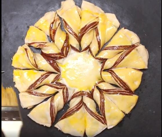 Zatim stavite čašu na sredinu kruga i oštrim nožem secite testo od čaše ka kraju kruga praveći "rese" od testa. Svaku resu blago uvijte. Premažite sa jajetom i pecite na 170 stepeni 40 minuta.