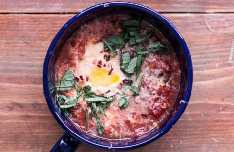 Priprema: U šolju sipajte iseckani paradajz (konzervu), dodajte kašičicu iseckanog belog luka, posolite i promešajte. Dodajte jedno jaje kome ste probušili nožem belance i stavite u mikrotalasnu pećnicu na tri minuta. Kada je jaje gotovo, izvadite iz mikrotalasne, pospite suvom paprikom, svežim bosiljkom i parmezanom. Poslužite uz hrskavi tost i navalite na ekspresan doručak koji će obožavati baš svako.