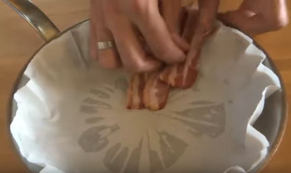 1. Na nauljen tiganj ili pleh stavite papir za pečenje koji ste prethodno isekli u obliku kruga. Preko njega ređajte slaninu u krug, dok ne dobijete ovo: