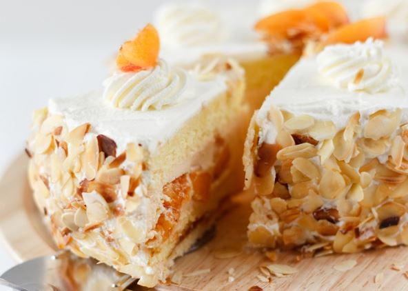 3. Tortu prekrijte drugom polovinom šlaga i ukrasite listićima badema i komadićima kandiranih kajsija.