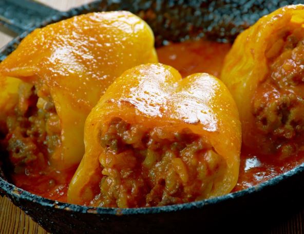 2. Izmešati i začiniti po ukusu, a zatim pripremljenom smesom puniti paprike. Svaku zatvoriti kolutom od krompira, složiti punjene paprike uspravno u posudu i preliti belim sosom.