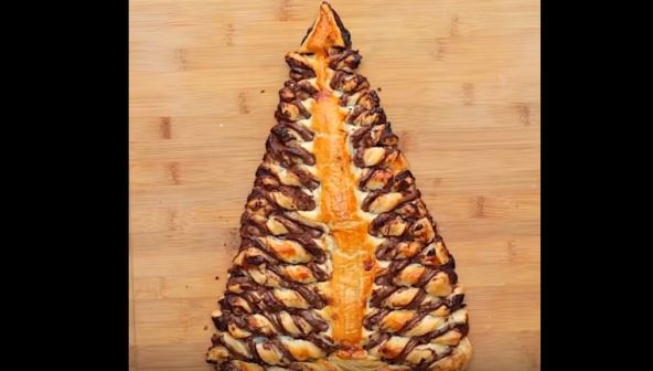 Priprema: Na razvučeno lisnato testo namažite čokoladni krem, pa preko sloja krema stavite još jedno razvučeno testo. Sa strane isecite testo sa čokoladnim kremom u oblik jelke, a višak testa sklonite. Svoju jelku od testa isecite sa strane na "rese", a kada ih isečete uvijajte ih spiralno, kao u video prilogu, piše Lisa.rs.