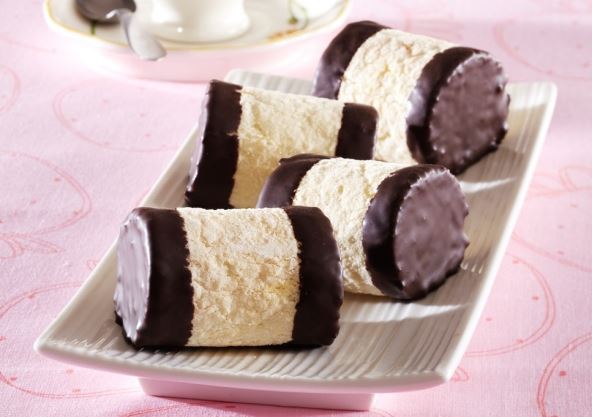 5. Isecite na komade pravougaonog oblika, pa svaki komad urolajte. Svaku "sarmu" još malo uvaljati u kokos koji je ispod i posuti još kokosom po želji. Čuvati u frižideru do služenja ili odmah služiti.