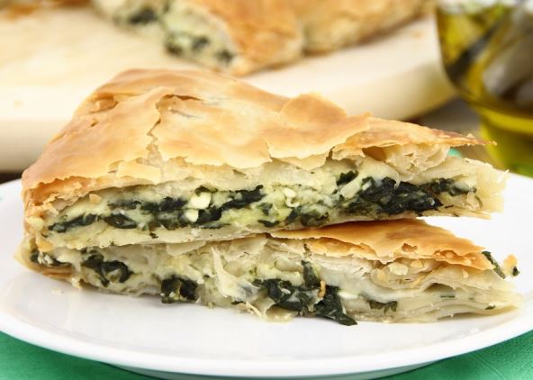 2. Na dno nauljenog pleha staviti dve kore, malo ih nagužvati i poprskati uljem, zatim ređati fil od spanaća, kore (nagužvane), narendati tofu sir, pa opet staviti kore, fil od spanaća, kore, sir i tako ponavljati dok se ne utroše kore i fil.