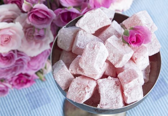 4. Dodajte 6 do 8 kapi esencije ruže, pa masu izlijte u veću emajliranu tepsiju. Kad se dobro ohladi, seći na sitne komadiće i uvaljati u prah šećer. Dobro paziti da ratluk ne ostane redak, da se ne lepi i da se ne prekuva, jer će biti žilav.