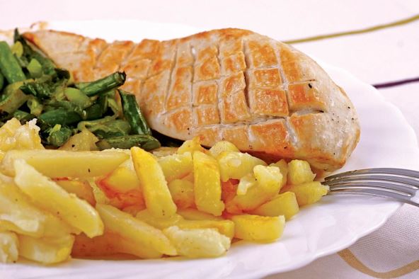 Krompir oljuštiti, oprati i skuvati. Pileće meso oprati, ocediti i iseći na štapiće. Na zagrejanom ulju pržiti belo pileće meso. Kad meso porumeni preliti ga vinom i kuvati oko 3 minuta. Nakon toga, posoliti i dodati krompir isečen na deblje kriške. Umešati iseckanu mirođiju i dinstati još 3 minuta. Jelo zaliti pavlakom i ostaviti da proključa.