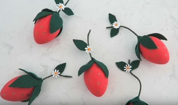 Kako biste jaja dekorisali da izgledaju kao jagodice, potrebno je samo da ih obojite u crvenu boju, flomasterom iscrtate crne tačkice, a od zelenog kolaž papira napravite listiće.