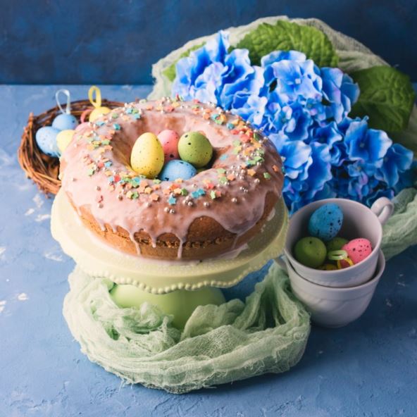 Kada se kolač ispeče, servirajte ga na ukrasnu tacnu, pospite ga šećerom u prahu, a njegu sredinu ispunite ofarbanim šarenim jajima.