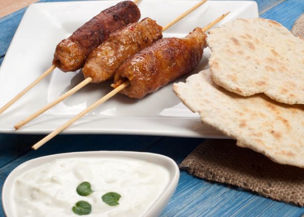 2. Operiite listove 200 g spanaća i očistite pola nara. Izmešajte ovčje kiselo mleko, so, biber i tri kašike maslinovog ulja. Ispecite ćevape na roštilju oko osam minuta. Servirajte s prelivom od kiselog mleka, uz spanać i nar.