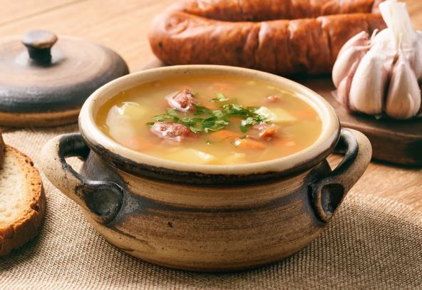 Sastojci: 400 g svinjske kolenice, 400 g kobasice, 50 g maslaca, ulja ili masti, glavica crnog luka, šargarepa, paprika, 40 g suvih pečuraka (najbolje vrganja), 100 gsuvih šljiva, 150-200 g kukuruznog griza ili dobro oprane heljde, kašika koncentrata, kašika paradajza, kašicica slatke paprike, 3 čena belog luka, 2 krompira, kesica krem-supe od pečuraka, 2 dl pavlakem so, biber, veza peršuna, ljuta papričica po želji.