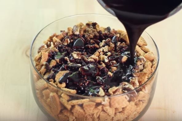 Priprema: Sav keks izlomiti i ostaviti u većoj posudi. Propržiti orahe oko 5 minuta, povremeno mešajući, pa dodati u izlomljeni keks.