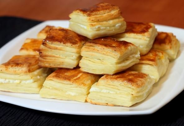Razvucite opet testo i preklopite sa leve strane na desnu, pa desnu stranu preko leve. Dobijenu traku opet razvući, pa isto preklopiti na tri dela. Pritiskajući oklagijom, ne valjajući, razvlačite testo. Na pola testa nanesite sir i rasporedite. Preklopite testo, odsecite tanko ivice i onda secite u kvadrate ili pravougaonike, manje ili veće, po želji i slažite u nauljen pleh.