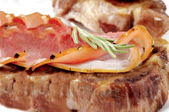 Meso začinite i pržite na delu ulja. Na drugoj polovini ulja kratko propržite naseckanu dimljenu šunku, dodajte isečen crveni i zeleni kupus i dinstajte par minuta. Servirajte kare na tanjir uz prilog od kupusa, pospite susamom i poslužite uz ražani hleb.